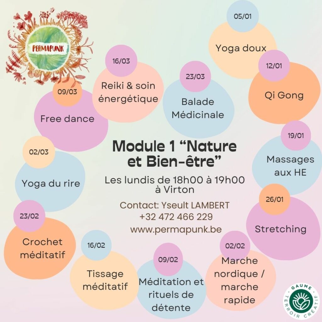 Permapunk propose, 3 fois par an, des modules de 12 ateliers hebdomadaires de détente et relaxation, méditation, mouvements doux, en connexion avec la Nature et les plantes médicinales.