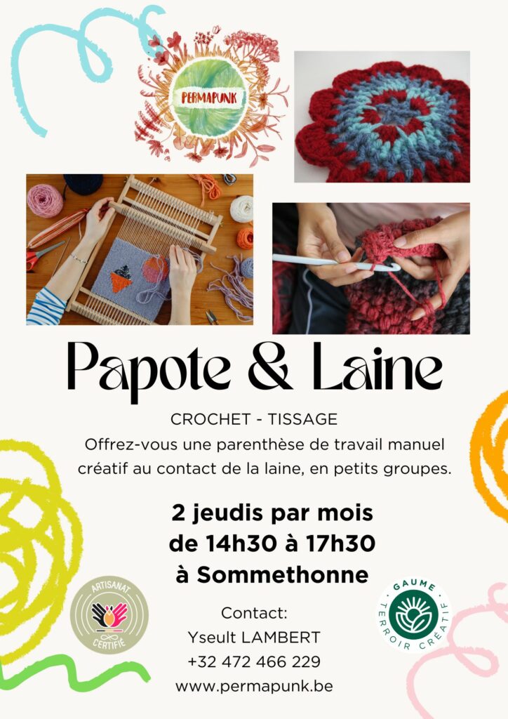 – Jeudi 23/04, de 14h30 à 17h30: atelier Papote & Laine – Découverte du tissage et du crochet – Lieu: Sommethonne – Prix: 35€ – Il reste 6 places.