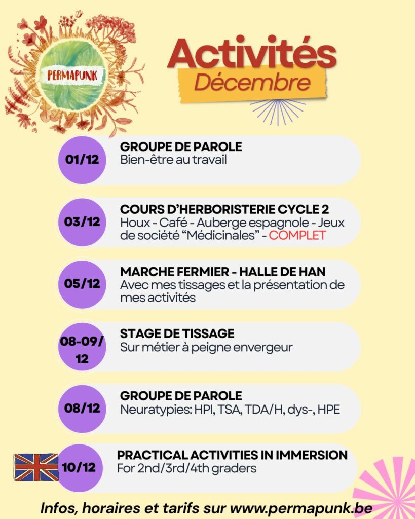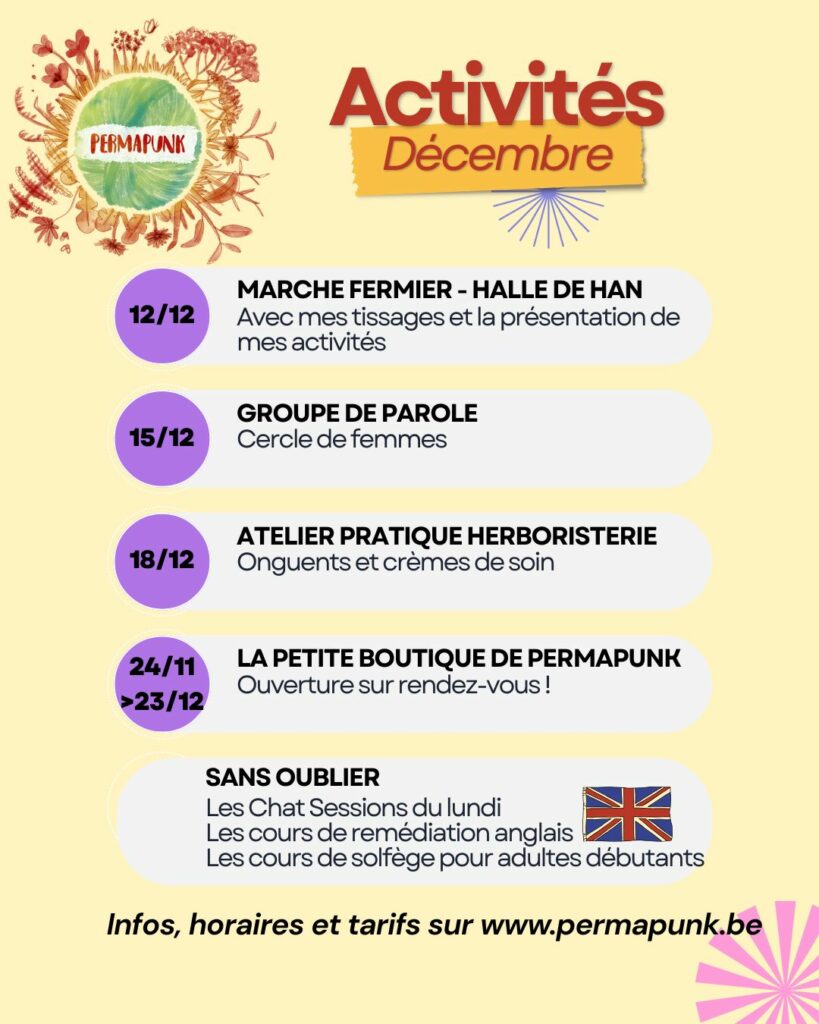 Avant cela, fin janvier, les nouvelles activités démarreront: les sessions « Bien-Être au Naturel » à Virton, et les ateliers ados/adultes du mercredi après-midi à Sommethonne.