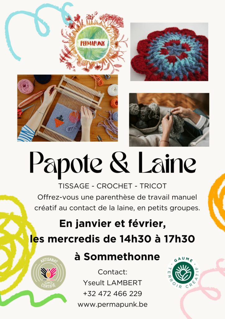 La laine est fournie. Le matériel de tissage est mis à disposition sur place. Prévoyez du matériel de base pour le crochet et/ou le tricot. Grignotages prévus.